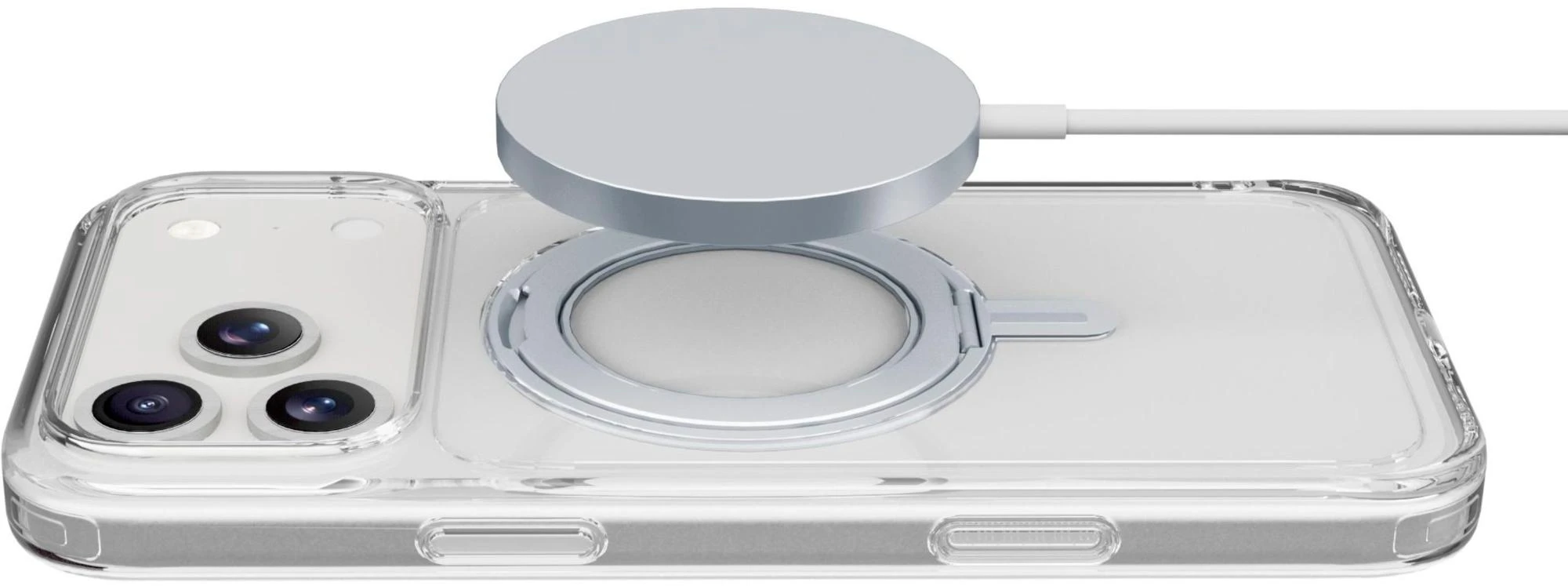 SPIN MAG ist die transparente Hülle mit drehbarem Ständer, die mit dem MagSafe-System kompatibel ist. Es zeichnet sich durch einen um 360 Grad drehbaren Ring aus, der es dem Gehäuse ermöglicht, verschiedene Funktionen wie Stand- und Halterungsfunktionen zu übernehmen. Der Ring ist integriert und wird bei Nichtgebrauch zu einem integralen Bestandteil des Gehäuses, sodass es mit MagSafe-Zubehör kompatibel ist. Die erhöhten Kanten rund um das Display und die Kamerabereiche schützen das Telefon vor versehentlichen Stößen und Stürzen.